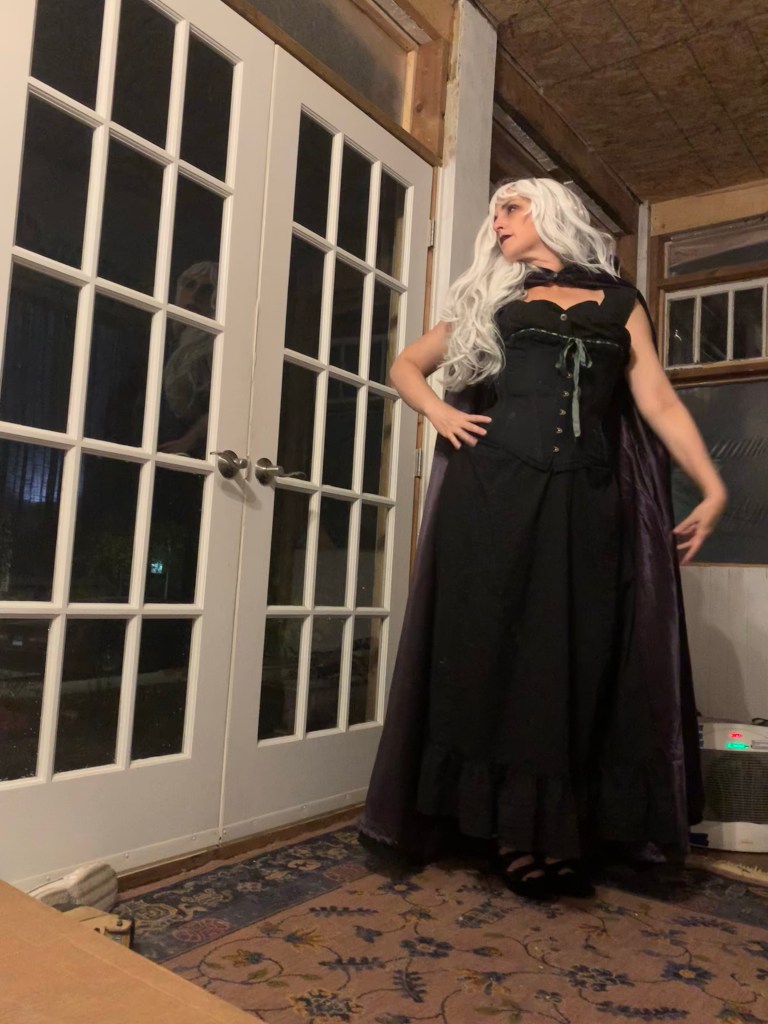 The black corset showed up at the last possible second, after I had turned most of the house upside down looking for it, in a place I had checked several times before. So here’s a quick peek at the final look, or something like it: