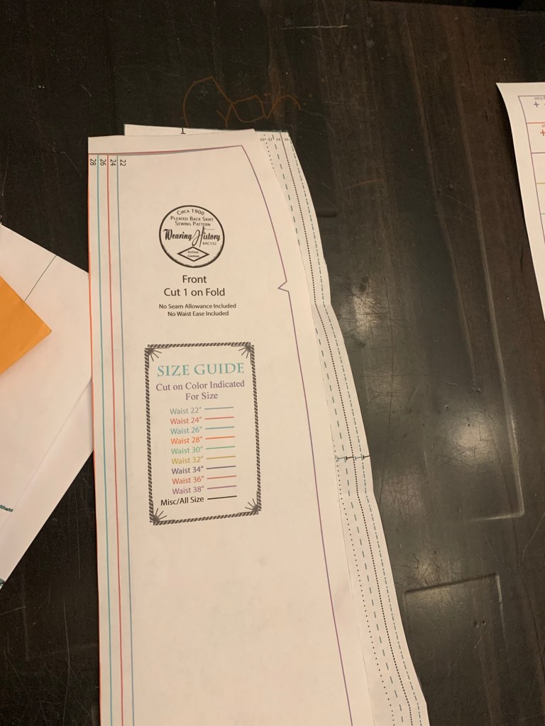 The grainlines of the patterns also differ, with the Fantail having a more modern style of grainline falling in the middle of the gore while the Wearing History original grainlines are the old fashioned type where they parallel one edge of the gore. However, the Fantail instructions also mention the variability of grainlines in the period, and when I made my version I used “old style” grainlines to get the pattern to fit on my limited yardage.