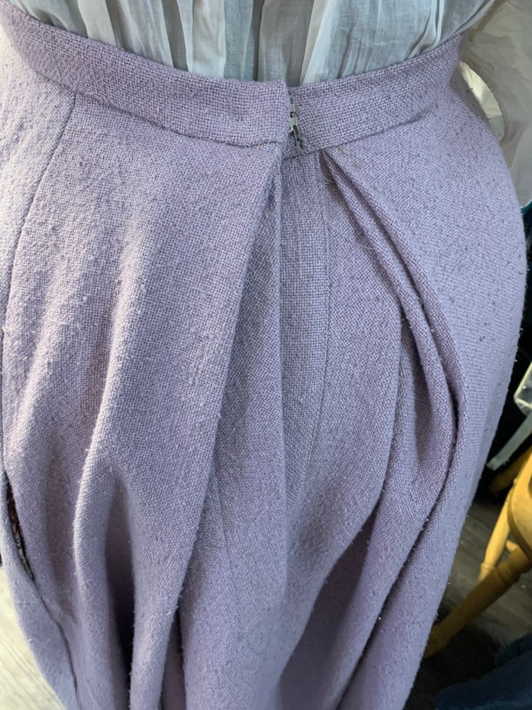 One thing the pattern lacks is a pocket. I’m honestly not sure how common they were in this period, with the narrower skirts clinging over the hips, but there’s still room to tuck one under the pleats in the back, so I did. I used the same method I always do, which comes from an 1887 sewing manual—so potentially a bit dated for this skirt’s era but not unreasonable. I didn’t manage the tidiest insertion (particularly when trying to topstitch along that seam) but it’s tucked around back where I don’t have to look at it so it doesn’t bother me at all.