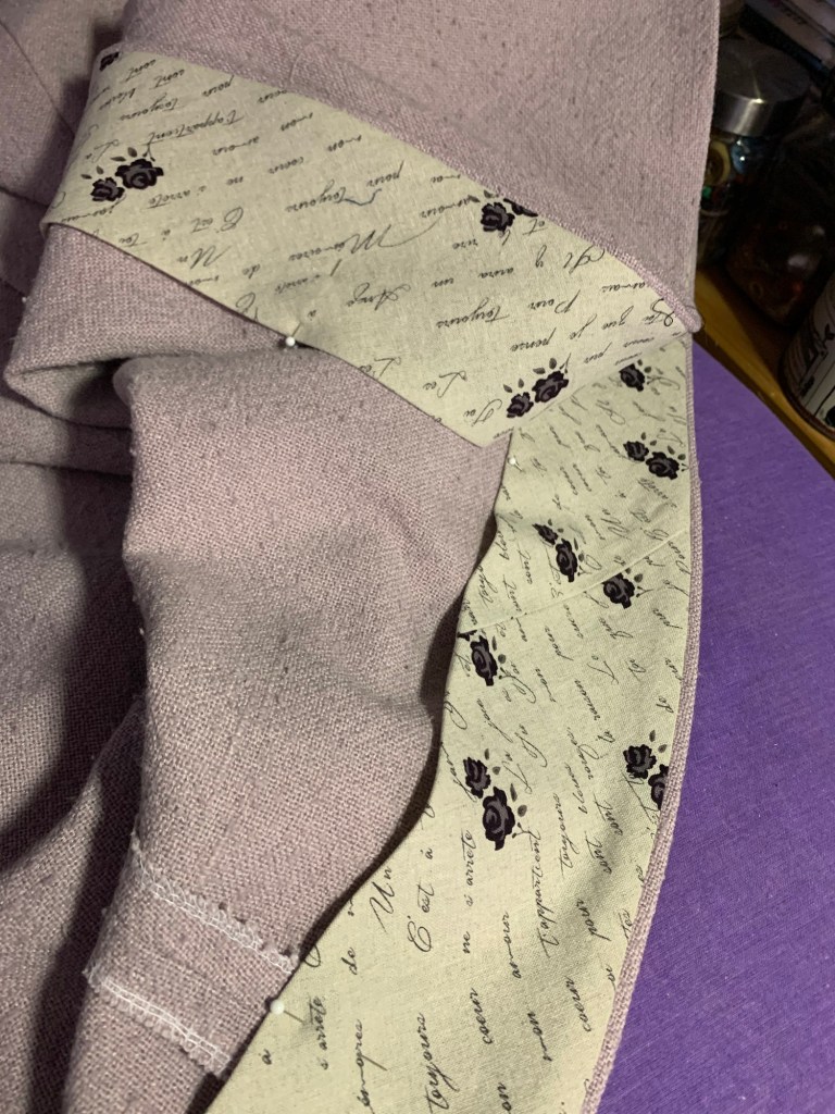 So, since I basically had no hem allowance, I decided to do a faced hem. This is a legit period way to do it, although mine is a pretty simple facing, and they often jazzed them up in period with additional layers of velveteen binding or stiffening or braid. I would have to double-check if bias was appropriate at this point in history; certainly a little earlier they were perfectly happy to cut their facings straight and just ease or pleat the top edge as necessary to have them fit. But I also serged all my seams here, I wasn’t in the mood to be too precious about historical accuracy.