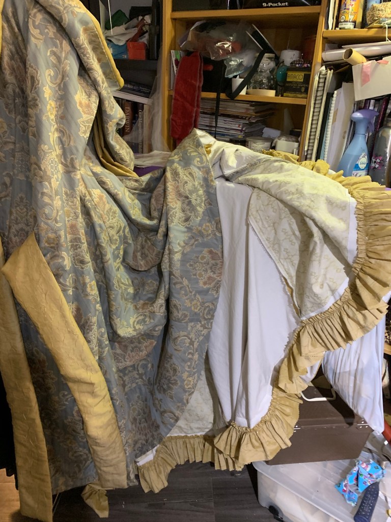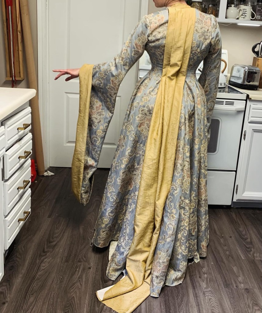 For fabric, I went with this gorgeous blue-grey upholstery jacquard I have been sitting on for YEARS since I got it on a steep sale at Fabricland back when I worked there and haunted all the sales. I did, however, have to go back to find a pale gold lining fabric, which I found in the bargain centre for three dollars/metre, so I’m not going to complain about that, either. The crinkly texture is utterly ahistorical but it’s fun and this is first and foremost a fantasy costume so we’re not going to dwell on it.