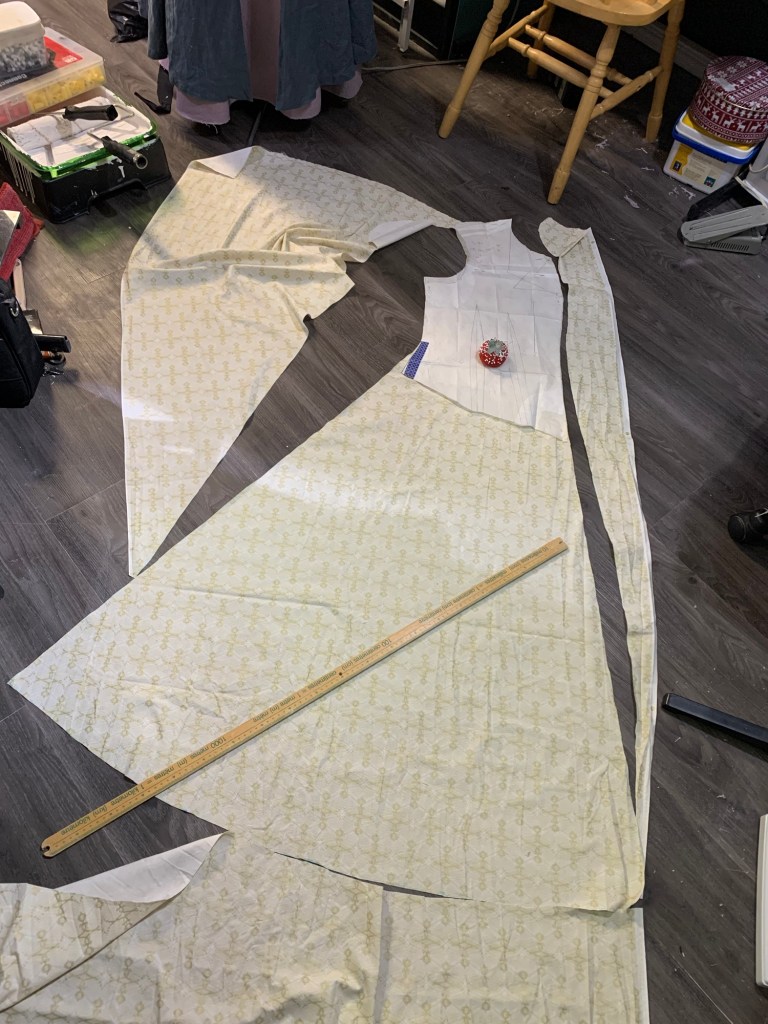 I drafted the draping mediaeval-inspired sleeves using the two-piece sleeve that goes with my bodice, but extending it down to a long, tapered rectangle. I was completely making this part up, but with some tweaking to the top seam I was able to get it to sorta work, though I’m pretty sure sleeves like this are never actually drafted this way.