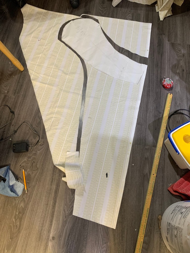 So I dug out some sturdy white polyester that I was happy to sacrifice to a purpose like this and made about a million miles of 5” wide bias tape and added a hem facing. It’s still shorter than I’d like in the front, but we’ll cry about that later.