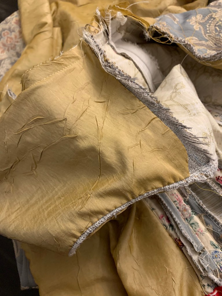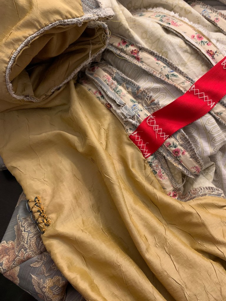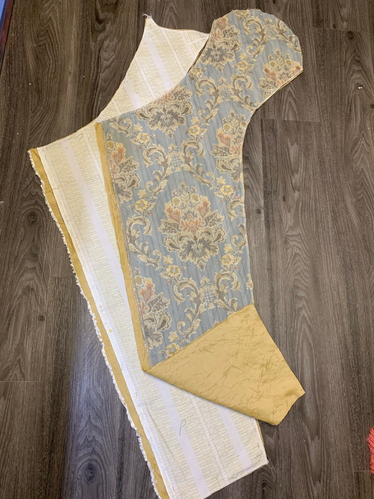 As I cut out my main fabric, it became tragically clear that I wouldn’t have enough for the Watteau pleating I so desperately wanted. However, some perusal of originals identified a few examples where the accent fabric was used to create the pleats, so once I had obtained my gold lining fabric I decided to use that. Initially I went with a full fabric width of pleating, because more is more, but eventually I decided that was just too much.