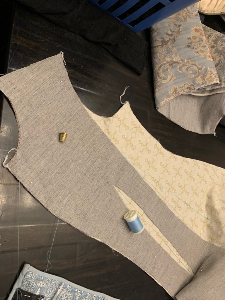 I decided to live dangerously and cut my skirt directly on the muslin fabric (which I was also hoping to use as my lining.) This worked out fairly well, except that my draft was a little short at the sides; I added extra fabric there when I cut the outer layer, figuring the gap would be covered by my final hem treatment. BUT, then I messed up: to save fabric I had pieced the side-back pieces of the muslin. No problem, except that then when ripping apart the muslin, the bodice portion of the piece got ripped off the skirt portion, and since I didn’t have notches or anything, I re-attached it wrong way around (since I made my gores historically asymmetrical). So I wound up adding my length in the wrong spot, or at least I would’ve needed twice the length I thought I did. So the whole damn thing just isn’t quite as long as I would’ve liked. And I was STILL short of fabric—I pieced several parts (so delightfully historically accurate!) and still had only scraps left. Anyway—-note to self, add 2-3 extra inches everywhere when drafting a skirt, at least you can trim it later!