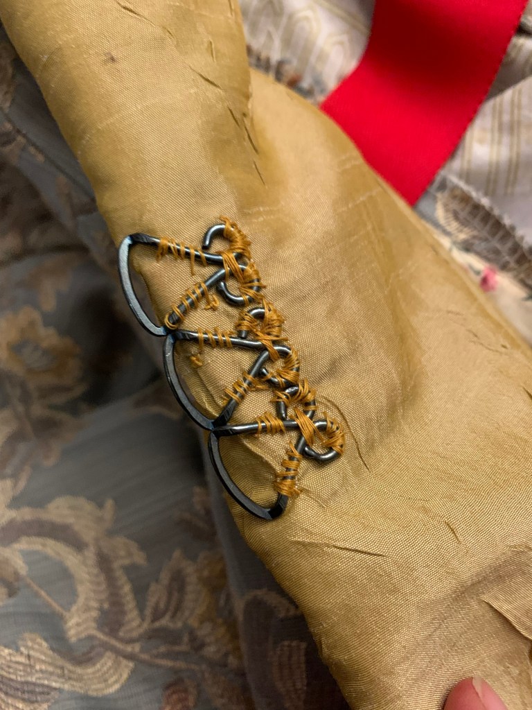 For the laced front, I sacrificed the “eye” side of some gorgeous ornamental hooks and eyes from Farthingales. Hopefully I can use their corresponding hooks with thread bars, or even make my own from wire. Or maybe I’ll find different eyes and swap them out sometime.
