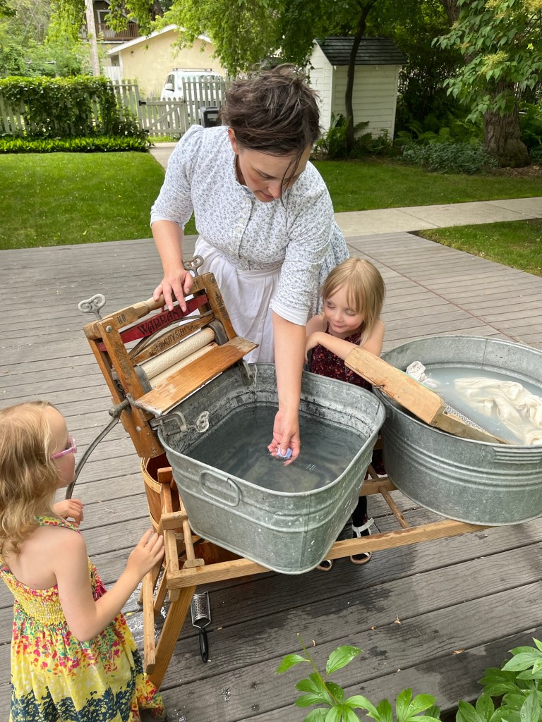 The twins had the most fun, running a couple of rags through the mangle endlessly, as well as grating soap and scrubbing on the wash board. Several years of dirt got washed out of my petticoats, particularly the flannel one that I’ve been wearing in real life the last couple of winters. I also did a bit of starching, including testing out a “coffee starch” on my black petticoat, although I didn’t get as far as ironing any of it.