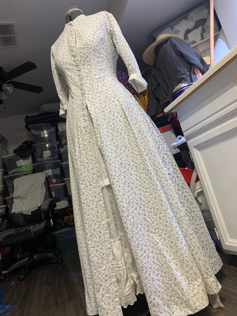 I even attached the buttons by machine, something I almost never do. I spaced the buttons pretty closely, which is period but I feel like I could’ve gotten away with just slightly further apart. I put on 24 buttons just between neck and hips (and then decided I would just wear my apron so the skirt could stay buttonless for now. Apparently leaving your wrapper skirt unbuttoned to show a bit of fancy petticoat was also a Look, although maybe not a work dress look.)