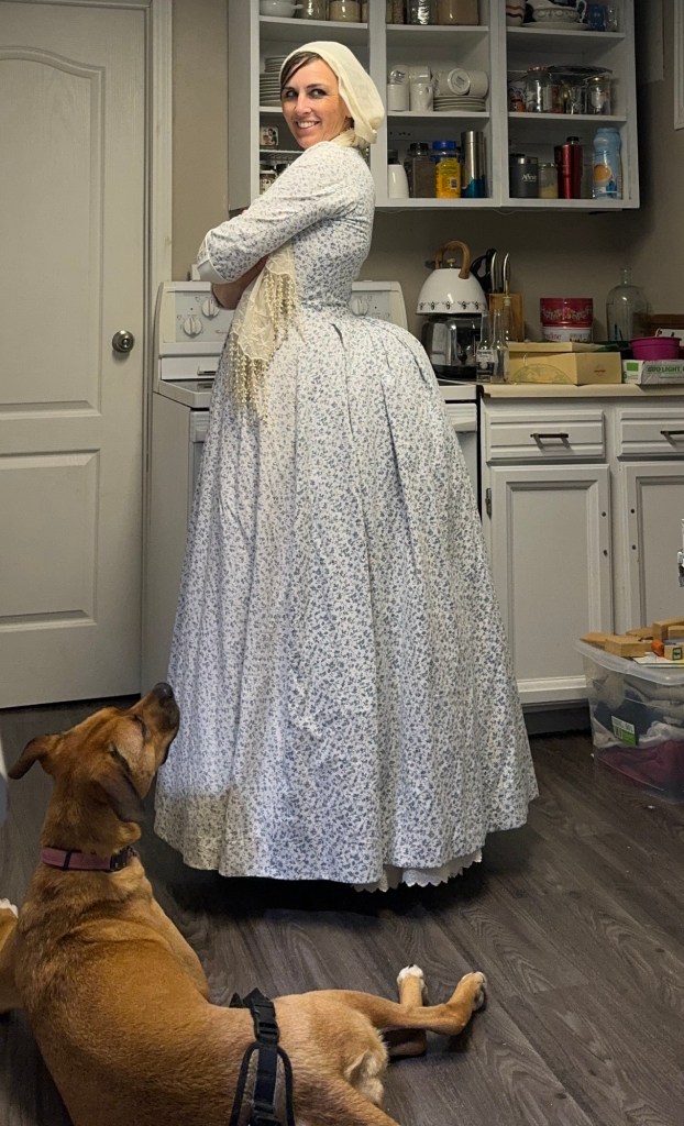 (But what is a wrapper, you ask? Well, aside from the things labeled “wrappers” in the advertisement above, this article has a quick section on them. Basically, it’s a one-piece dress, front fastening, looser than a going out dress and often adjustable. Key for my purposes, they are intended for wearing during breakfast and morning chores. They could also, probably not coincidentally, be worn easily while pregnant, although not so much the style I went with.)