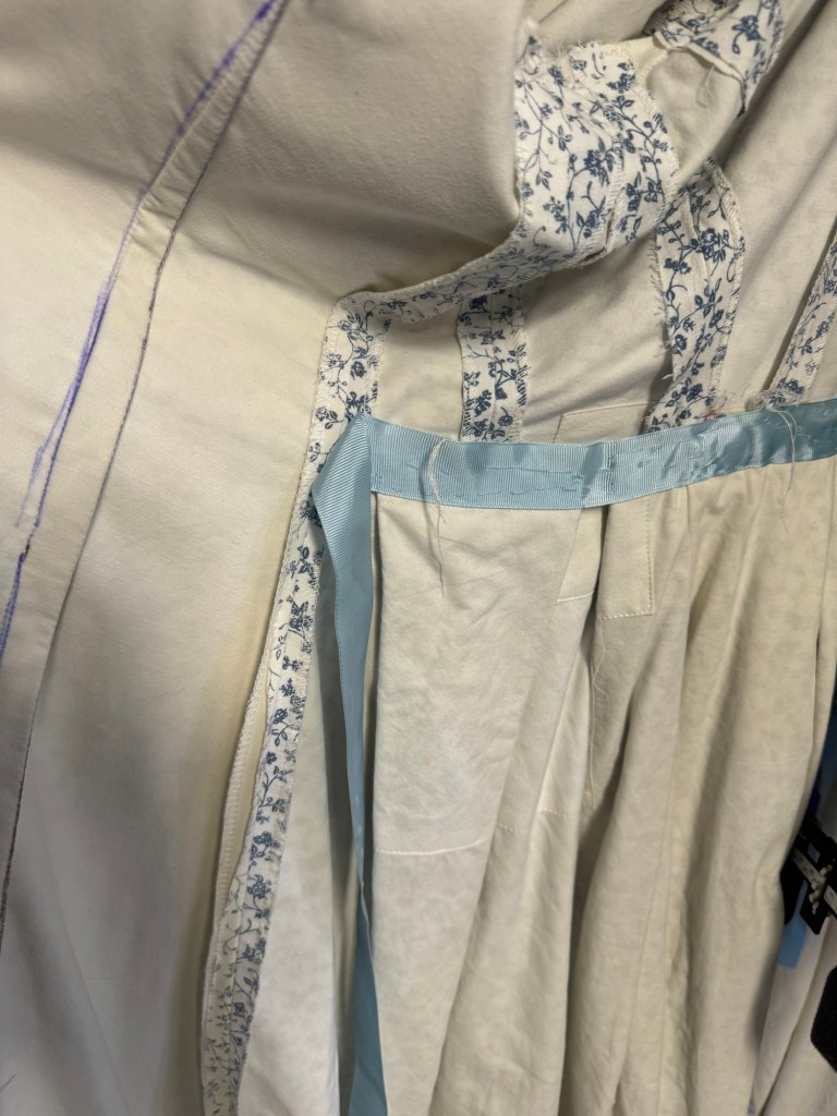 I did this by the very inelegant method of adding a 1” tuck just above the bottom ruffles. Because the front and sides are gored (i.e., wider at the bottom than the top) this means that the underside of the tuck needs to be eased to fit. The period manuals talk about basting a gathering stitch along that line and easing it in. I just pressed and hoped. It mostly worked out better than expected, though there are one or two bad spots.