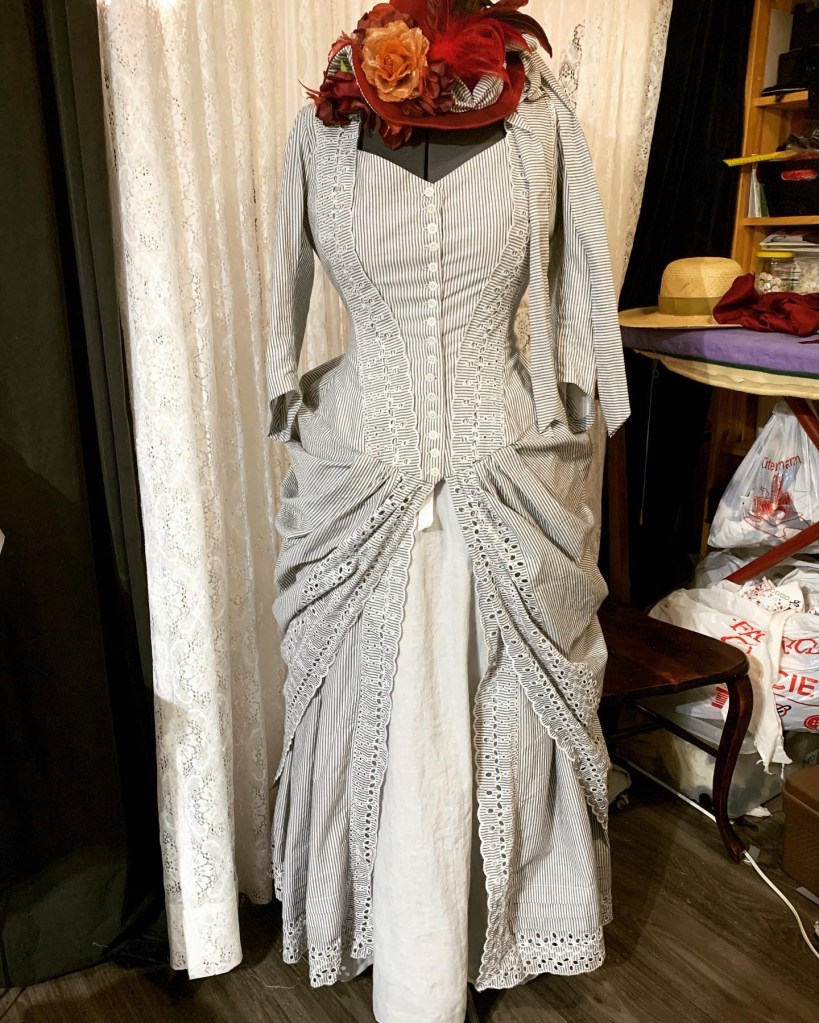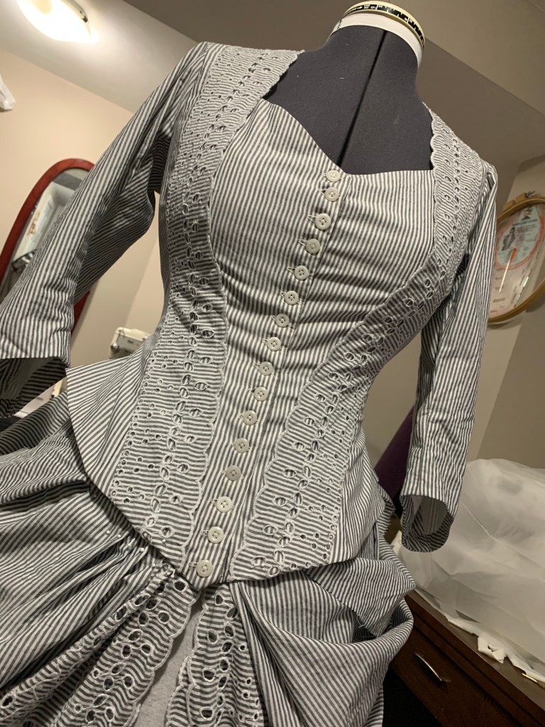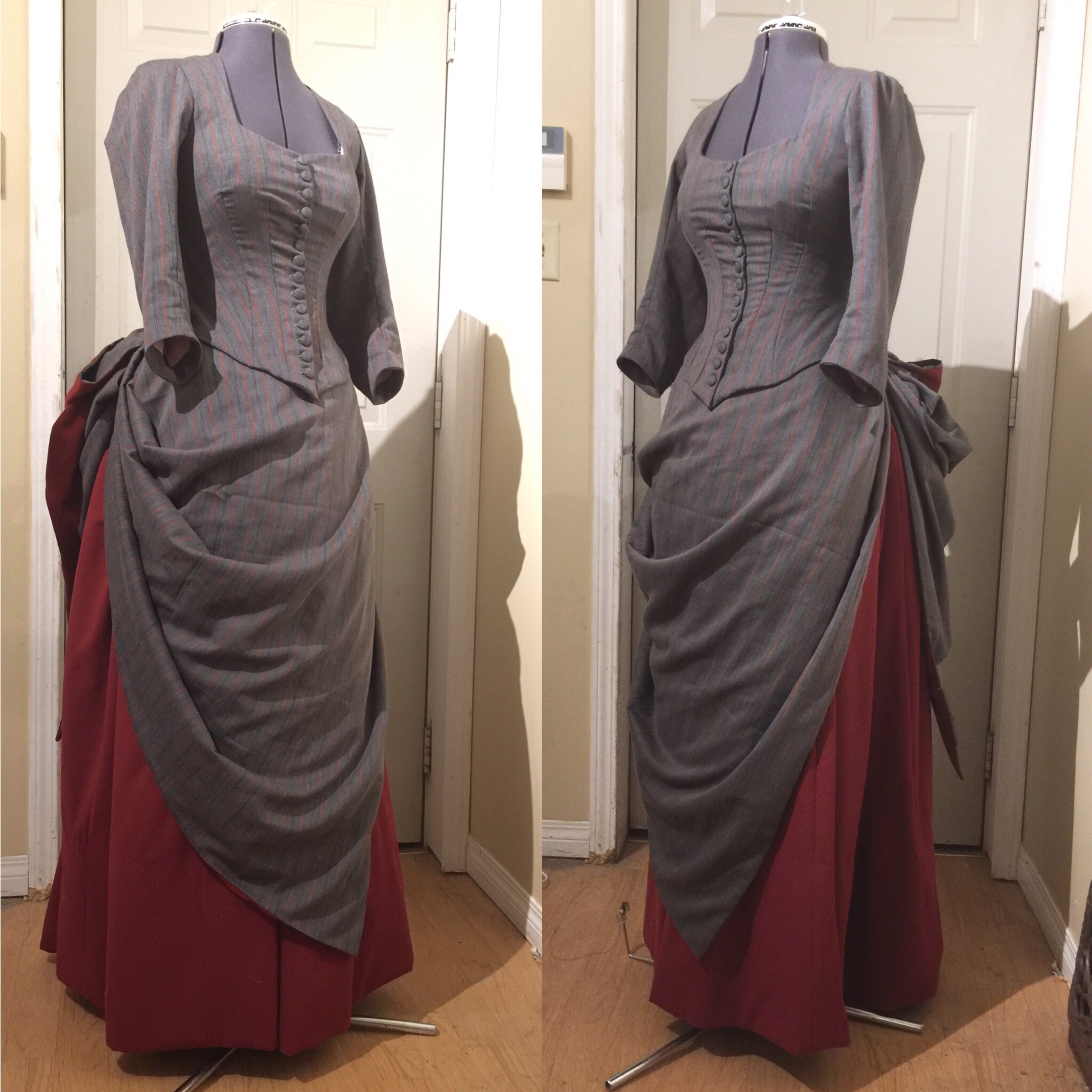 And that’s about that! I’d like to add a big red bow on top of the bustle, and I might just have enough long skinny scraps to add the 4” ruffle the pattern describes to the foundation skirt, if I want to. I’m contemplating some hooks and eyes at the bottom front of the bodice, to keep the various layers all together in the front, since that’s one of the things I like about the original illustration. But on the whole this has been a much bigger project than I had originally envisioned, so I’m happy just to get to wearable!