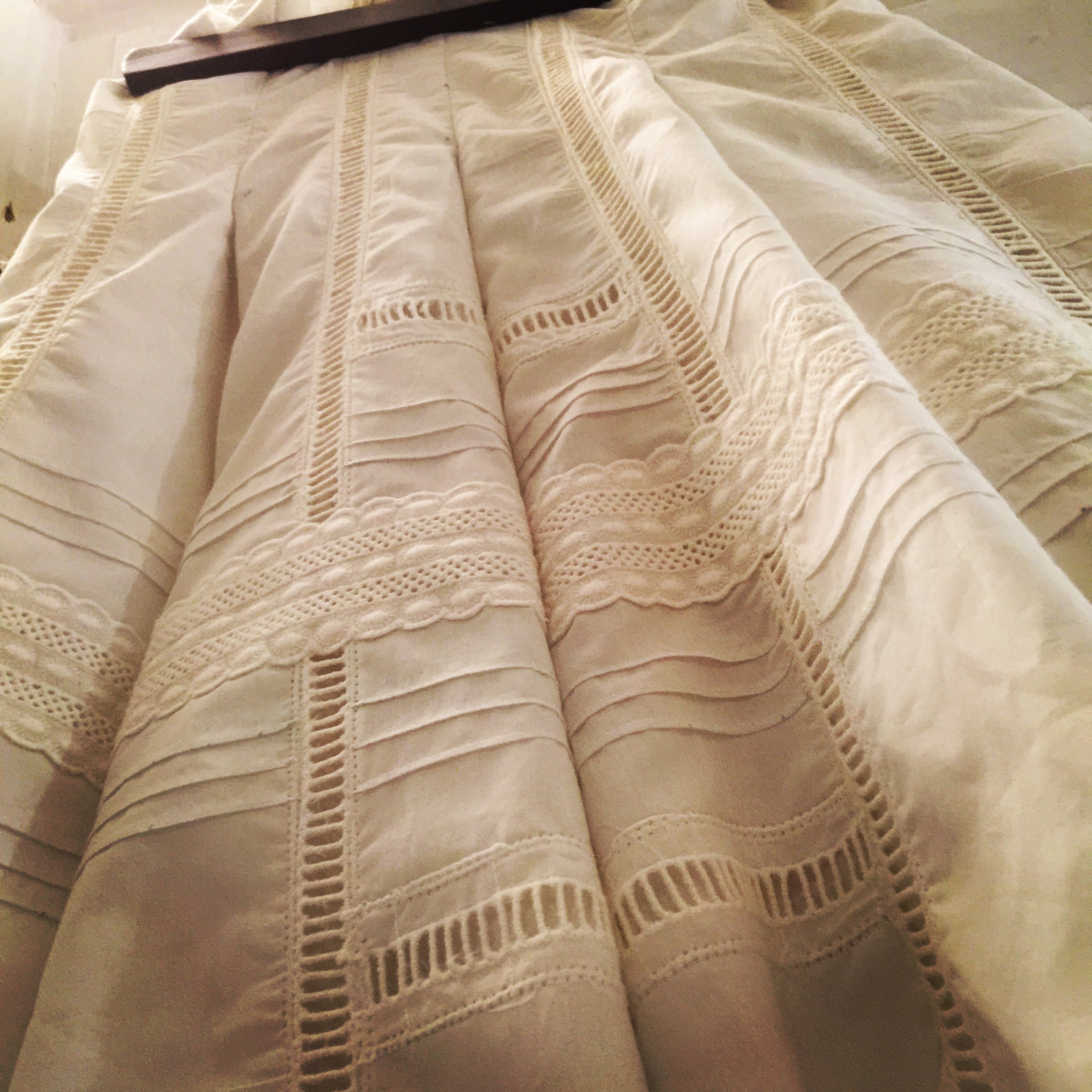 I think cutting the strip off the bottom may actually have taken longer than embroidering it. But eventually it was done. Then I remembered I also needed to add three 1” tucks to the “flat breadths” panel before I pieced on the edging at the short ends.