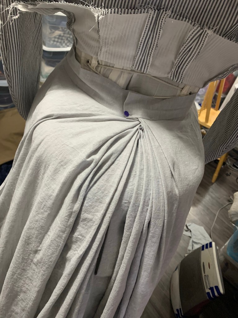 Based on the terse instructions, I actually think the “flat breadths” layer was supposed to be attached directly to the foundation skirt, attaching partway down, even though the illustration doesn’t exactly fit with this idea. But I didn’t want to do it that way, mainly because I feel like I might want to wear the foundation skirt alone for other things. As a result my “straight breadths” are pleated into a twill tape waistband and hike up a bit in the back. If I really wanted I could probably come up with a bit of an upper skirt to mount them to, but at the moment I’m not sure I’ll bother.