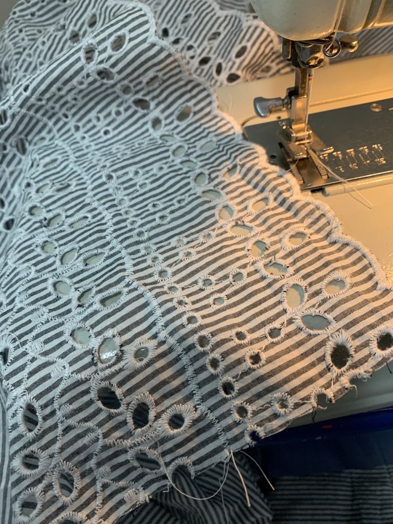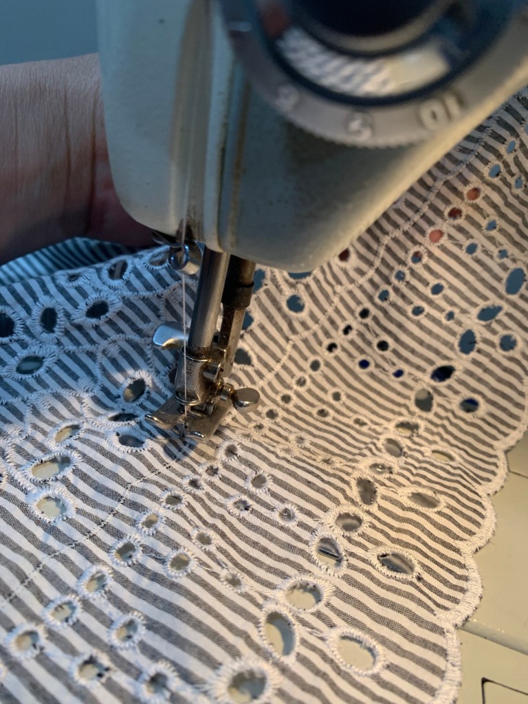 You see, as it happened the existing border embroidery was arranged kind of in two rows with a small space between them. This made it possible, with enough patience, to add a scalloped zig-zag in the space between that I could then cut along, instantly doubling the amount of eyelet edge I had available.