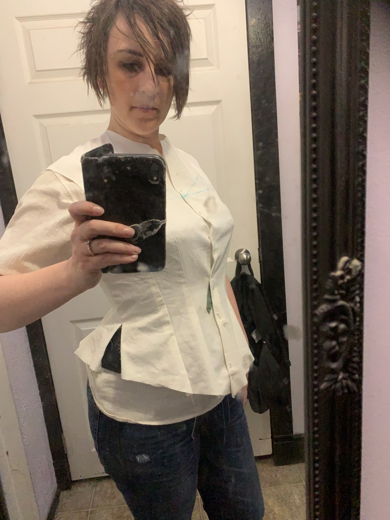 The tension was actually being fairly well behaved, but the embroidery stitches didn’t seem to be engaging, or at least only very randomly. I eventually traced the issue to a series of little levers under the main cover of the machine that are supposed to drop down into slots depending on which stitch option is selected, which were not dropping without manual assistance. So, eventually, I was able to get it to do a scallop the length that I wanted—but there didn’t seem to be a width adjustment available for the scallop setting, and I could only make it do a very narrow zig-zag. I think this is a limitation of the machine, since it has a fairly narrow total stitch width; in the end I went over the automatic scallop with a wider zig-zag freehand, and aside from the tension being a little too low (I had turned it down as that tends to work best for machine embroidery, and it looked great on top and didn’t pucker up the fabric, but it is quite loopy on the back side.) It’s not indistinguishable from the original, but it won’t be noticeable, and I desperately needed that extra length of edging.