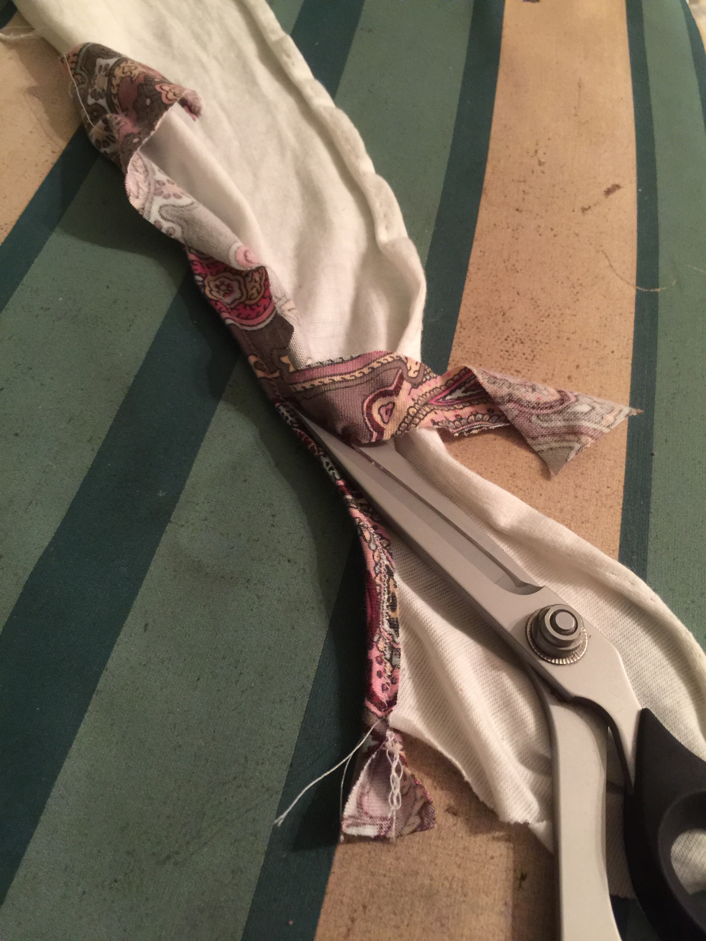So the good news was, I didn’t need to trace another copy of my pattern—just take a few inches out of the length. And Tyo wanted her vision completed badly enough she was even willing to help cut the fabric.