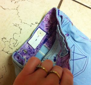 I made some other alterations that are kinda standard at this point for making 2908 kids’ jeans. I curved in the yoke a bit more (easy since I was already putting a tuck in it), although not as much as I often do as Waif’s bottom is considerably less curvaceous than, say, Tyo’s. (She seems  to take after her father in the that department, as Stylish, her mother, is the embodiment of what I think Tyo’s going to look like when she grows up. At least from the neck down.). I cut the waistband in long, narrow pieces rather than short, wide pieces with a back seam, and used my pocketing/piping fabric for the inner facing. This reduces bulk, but mostly I just like the flash of colour it adds to the inside. I bound the bottom of the band with more bias tape, as that’s every so much easier than trying to fold it under and have things come out nicely. And, I added buttonholes to insert adjustable buttonhole elastic, easily the best invention for kids’ pants in the last 20 years. (Tyo is going to have such a hard time finding pants that fit once she outgrows the ones that come with buttonhole elastic)