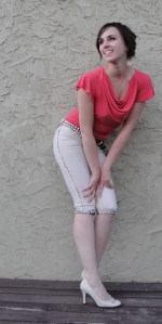 You may (hopefully not) remember that Tyo has a particularly stylish friend, who is embarrassingly close to being my style muse. Seriously, this kid has the best clothes. ALL the time. A lot of this is probably creditable to her mother, who is a good friend, too, but her mom’s style doesn’t particularly speak to me (not that she’s unstylish. Maybe it’s just our different body types). I stole the rear-calf dart from her. I won’t even get into the time we bought the same pair of knee-socks, or the stripey hand-warmers. And a few months ago, I was struck by some jeans she was wearing, which exaggerated that scrunched-at-the-bottom look so many skinny-jeans-wearers seem to go for. (This look doesn’t happen to me, at least with RTW pants, but that’s another issue). Basically, the front pant-leg is cut longer, and ruched to fit the back. Instant scrunch, half the bulk!