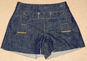The bright spot of light in this is that the fit itself is more-or-less perfect. I didn’t even have to make any kind of gaposis adjustment to the back, which I had to in both the Ellen pants and the Jalie 2908 jeans (granted I think the Jalie pattern is drafted to the flattest common denominator, possibly because they figured this was an easier adjustment to make than the flat-butt adjustment). The only alteration I made upon trying them on was to take in the outseam of the leg a little bit below the hip, so they are not quite so loose around the thigh. Which is more of a style issue, again, than a fit issue. The illustration shows quite loose, slouchy shorts, rather than my sturdy denim version (and the fabric they call for is “sheer flax”, by which I assume they mean a lightweight linen. They use the word “linen” for fabric.)
