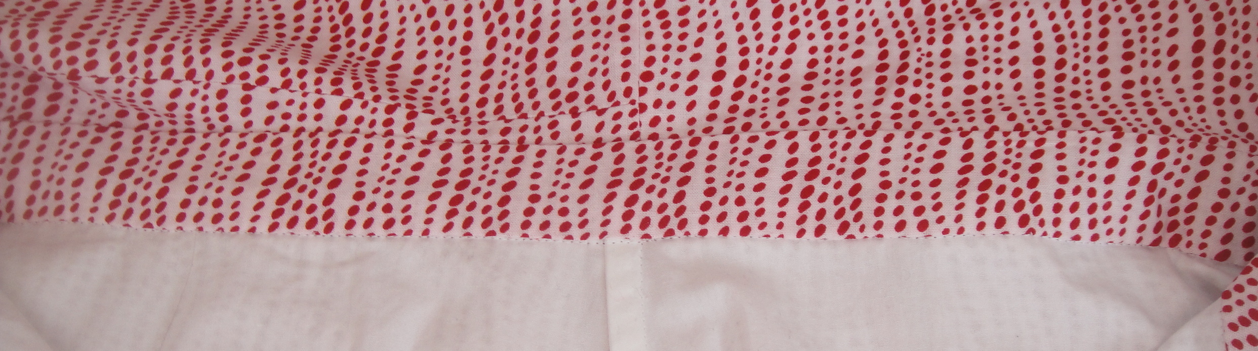 The bodice seams are all enclosed (yay!). For the skirt, I added a light cotton lining, and used French seams for the sideseams and Hong Kong binding for the front and back seams. I bound the CF seam on the skirt before stitching. This was a Bad Idea. For one thing, I hate trying to stitch evenly along already-finished edges. Even if they’re just serged, the edges always try to scoot so they don’t lie directly overtop of each other (my tendency to use pins as little as possible may be a factor here, too), and it was way worse with the binding. For another thing, after carefully stitching and trimming, I realized I managed to put the HK binding on backwards, so the un-finished edge is visible on the inside. *headdesk*