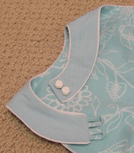 Having removed six inches in length, I didn’t really want to lose much more in the hem, so I put back the hem lace I’d been planning to use and dug out a package of teal hem-tape from one of my thrift-store scores that’s probably been in its package since about the time this pattern was new. I actually really like using a bias facing in curved hems like this. It works a bit better if you “circle” it first—iron it while stretching it into a curve.