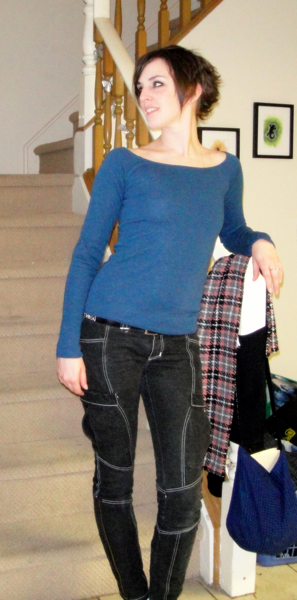 This would be that nebulous category that includes sweaters, hoodies, bunnyhugs, shrugs, cardigans… the stuff worn over your shirt to keep me warm. At this stage I have three me-made toppers, which you’d think would be adequate… the Kimono Lady Grey, the Simplicity Cardi-wrap, and the 50s shrug.ย I did wear the KLG several times, but a) it completely hides the shirt underneath, which makes me sad if it’s a cool shirt, and b) is so distinctive I don’t like to wear it that often (well, except for the first month after I made it when I wore it every day). I wore the shrug once, and the cardi-wrap not at all (although I did wear it yesterday just to prove something to myself, I guess). The shrug would get more use but for two things: 1) it’s not really warm enough, and 2) I don’t quite like the fit. I need to tweak the pattern a bit—narrow the neck, shorten the whole thing, maybe shorten the sleeves a tad as well, and narrow the waist. It’s a bit big, and even the original shrug was a bit too long in the back—it would probably be cropped on someone with a normal torso, but on me it reaches my waist, which is not the best look. It’s comfy and I do like it with a bright-coloured top, though. The cardi-wrap… well, again there’s two problems. The first is that I snipped a hole in it accidentally back in November. Although it’s usually hidden in the folds of the drape, it still annoys me when I notice it. I should stitch it up and call that good, I guess. Then there’s the colour. Not that I don’t love it. But it doesn’t coordinate at all well with the “springy” colours I’ve been sewing lately, I’m bored as hell of my basic black tops, and I don’t like the red-on-red look. Maybe I just need to be more bold and creative in my colour combos, I don’t know… So the upshot is that time and again, despite these options, I retreated to my lone, boring, black, workhorse RTW hoodie. I guess the moral of the story is that I’m still not quite sure what I’m looking for in a topper, so it’s hard to know in advance what I want. Although I need to try to remember pockets. Pockets are very, very good.