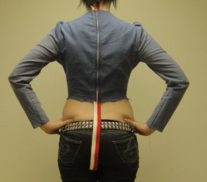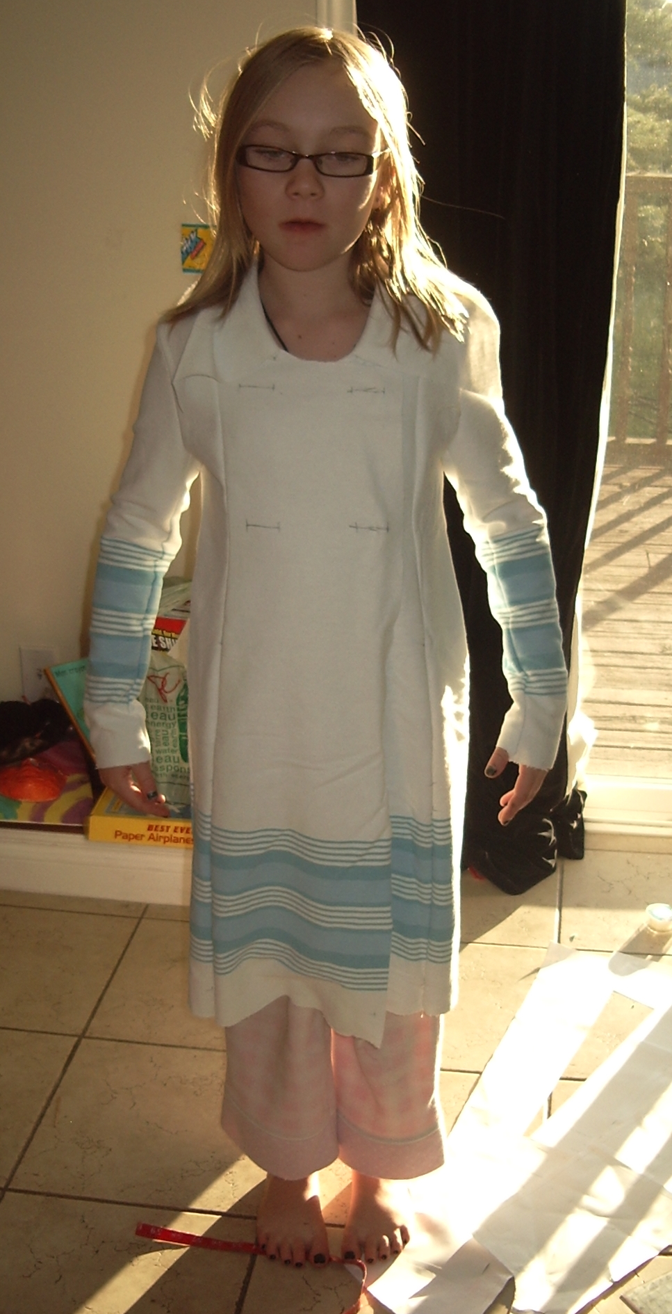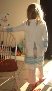 I took proper fitting photos but the combination of a weird camera angle, bad light, and the total lack of makeup and hair makes me unwilling to post the rest of them, sorry. Only the goofy one was entertaining enough to make up for the weird angle, and even then you’re not getting the face. So you’ll have to take me on my word that the fit seemed pretty good overall. The bust was just about perfect, darts pointed where they should, the shoulders etc. look good, but the waist obviously needs a bit more (more) room. At least if I want to, y’know, eat or breathe or anything like that.A small swayback adjustment (raising the rear waist seam in the middle by about 1 cm) will be in order, and a couple more cm ease at the waist, and I think I’ll call it good. Which means I’ve made almost none of my usual adjustments to this pattern. Interesting. (I’ll note that Tasia had to lengthen the waist on hers by a good inch.)