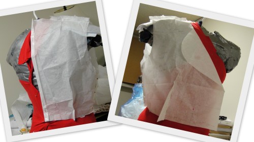So for the muslin, I added 1 cm to the side-seams of each piece, for a total increase around the body of 4 cm (just under 2″). And then I cut out and stitched up with, as mentioned above, traced seam-lines and everything.