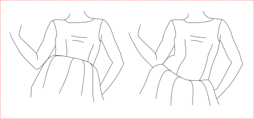 Part of me is saying “go for it!”—if I figure this out, I’ll have a basic fitted (albeit sleeveless) bodice I can use to adapt the zillions of waist-seamed dresses that are flooding my fantasy sewing these days. Part of me is saying “Give the gathered-waist look another try. You never know, it might be ok this time. Maybe the problem’s mostly in your head. Everyone else likes those gathered skirts!” On the other hand, looking at my little croquis there (which I traced right off the image at the beginning of the post) I know which one I prefer…