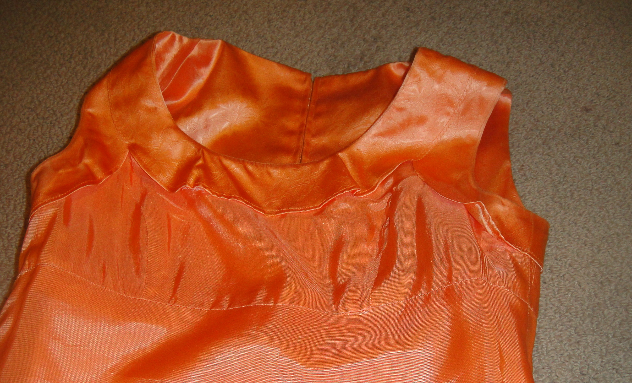 It’s a classic 60s sheath, high cut neckline, straight profile, with steep, curving French darts that reach the side seam somewhere around my hips. The dart placement is pretty good on me, but the tips are a little high. Presumably whoever made it was a shorty. Or very perky.