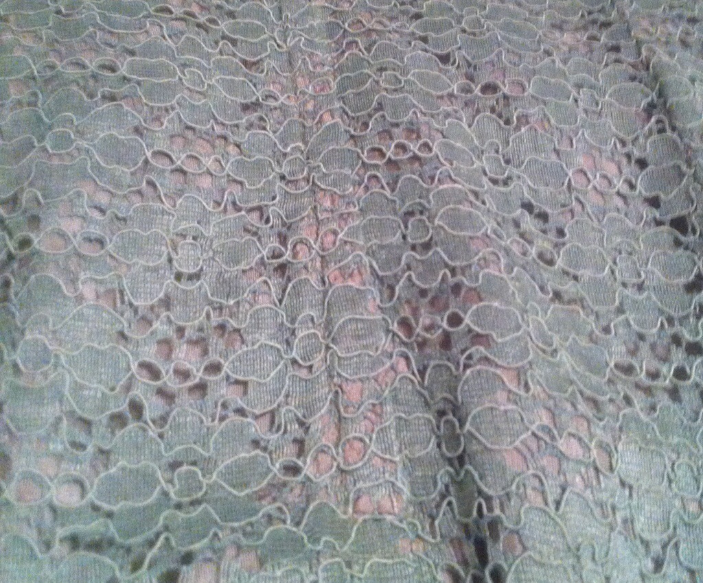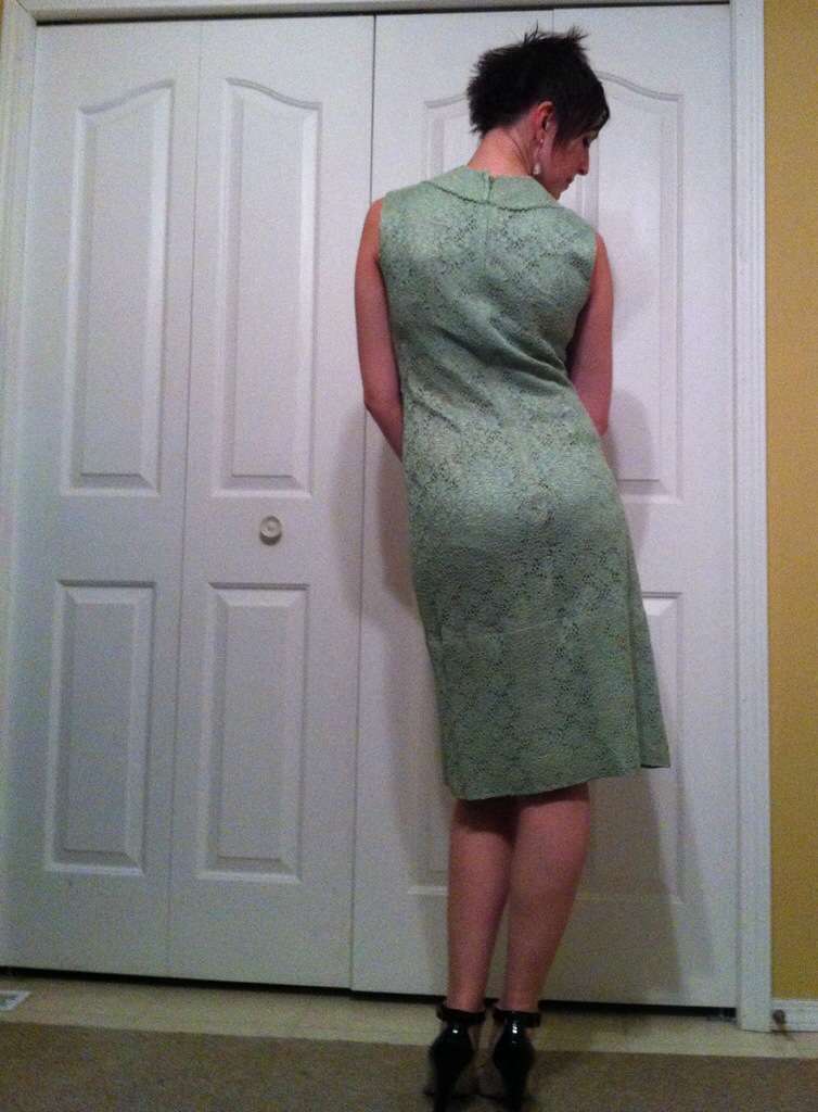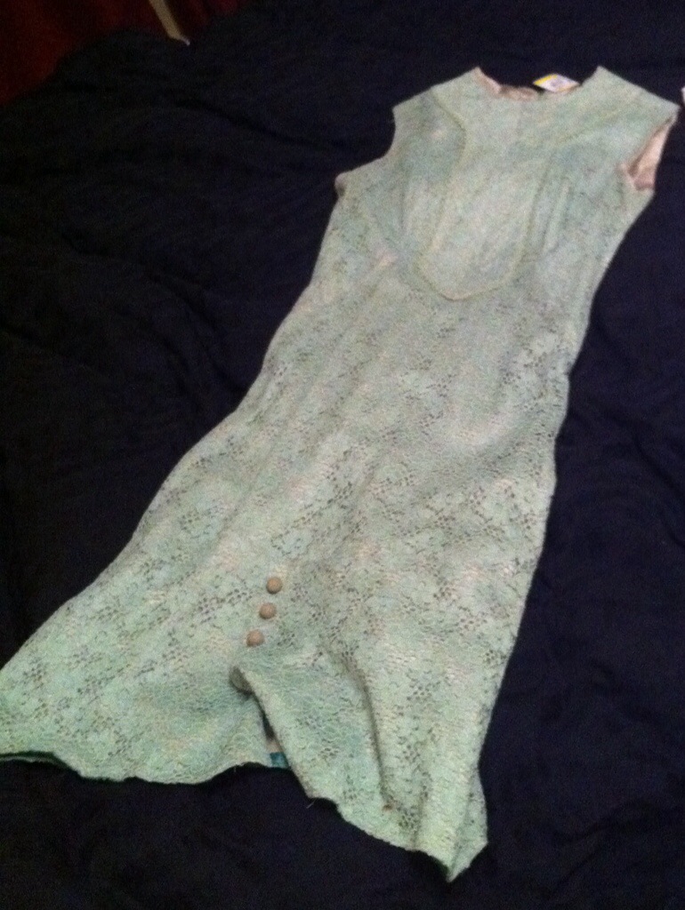 I assume it’s 60s. The construction is straight out of the Reader’s Digest Complete Guide to Sewing. It’s a green lace underlined with what is currently a rather beige lining (either rayon or a much nicer species of polyester than I’m used to.) I love the hem detail with the buttons (is that a flounce at the bottom or an extra-extra dropped waist?), not so much the high neck with the placket-yoke-thing.