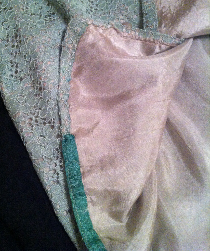 It’s trimmed in lace, which just barely stands out from the rest of the lace texture. I guess she was going for subtle. I do wonder how the colours have faded over time. Did it originally match better? Was the lining always a pale, nude under-layer, or did it used to be a brighter, seafoamy colour?