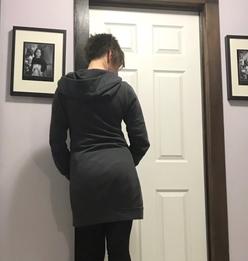 My mom’s coat is almost done—just needs buttons and the hem finished—so I took some time to play around. I had pre-washed this stripey end of heavy French Terry back before Christmas, thinking of a Paprika Patterns Jasper sweater-dress. But time was at a premium and then I realized that stripes plus princess seams could, um, be a little bit of a headache. Plus I was not at all sure I’d have enough fabric.