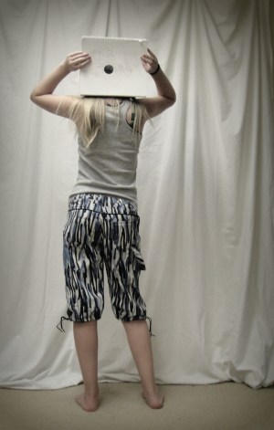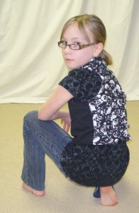 Ok, here’s how they wound up looking. (If you can see through the print, which you probably can’t.) Rear rise is good—not any too high, could probably have gone a little higher, but coverage is maintained even when she squats down. Yay! Yoke curve-in is good but could’ve been more extreme—there’s still plenty of extra ease at the waistband that isn’t there at the hips. There is still some slight wedgification happening—not enough to be uncomfortable (yet) but I can tell that the crotch curve is not perfect for her. Presumably scooping is in order? I’m really not sufficiently enamoured of this pattern to bother, but Tyo may be, in which case I’ll keep it in mind if we end up at Pair #3.