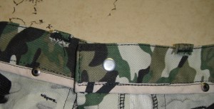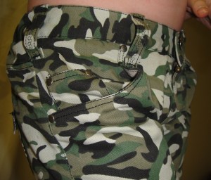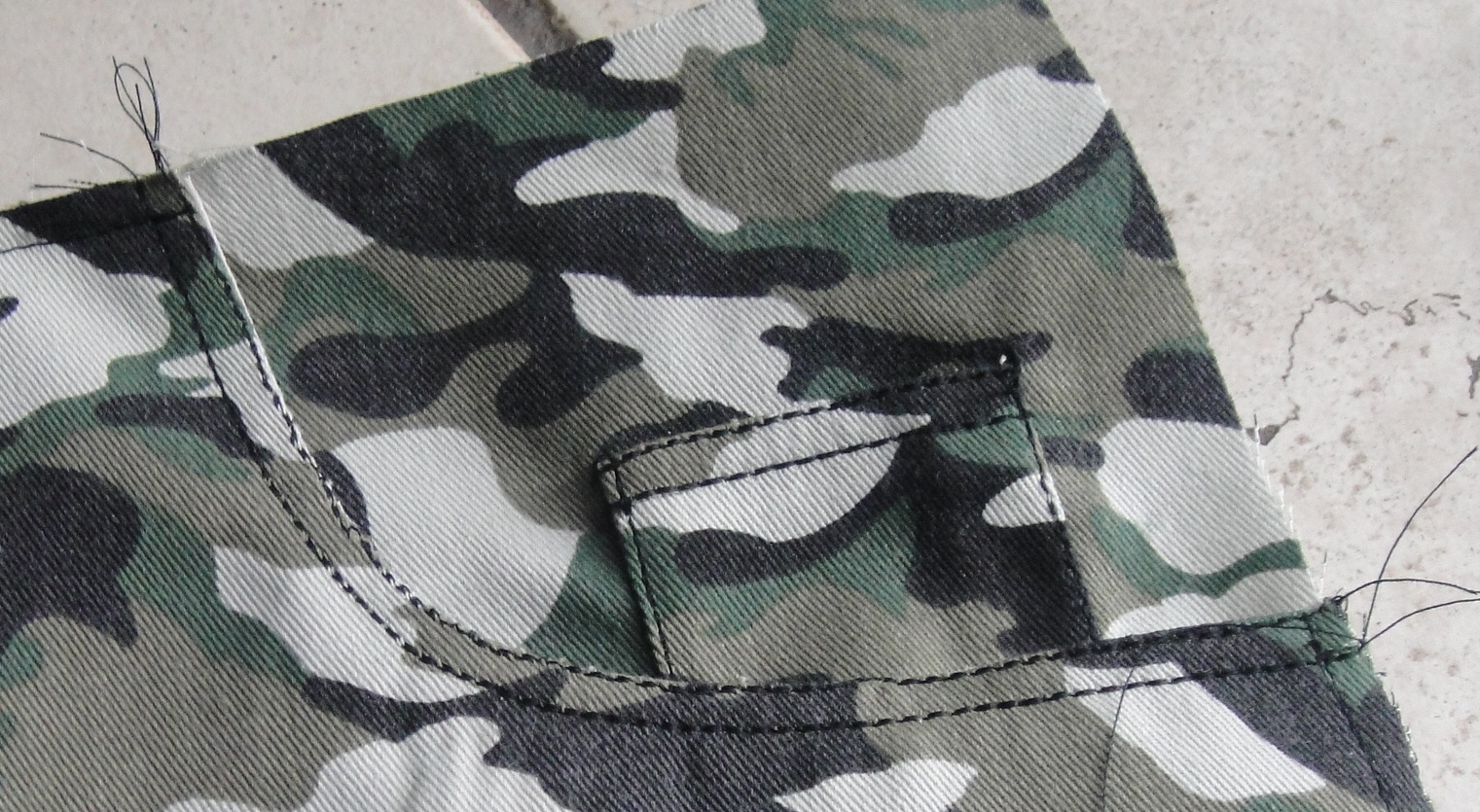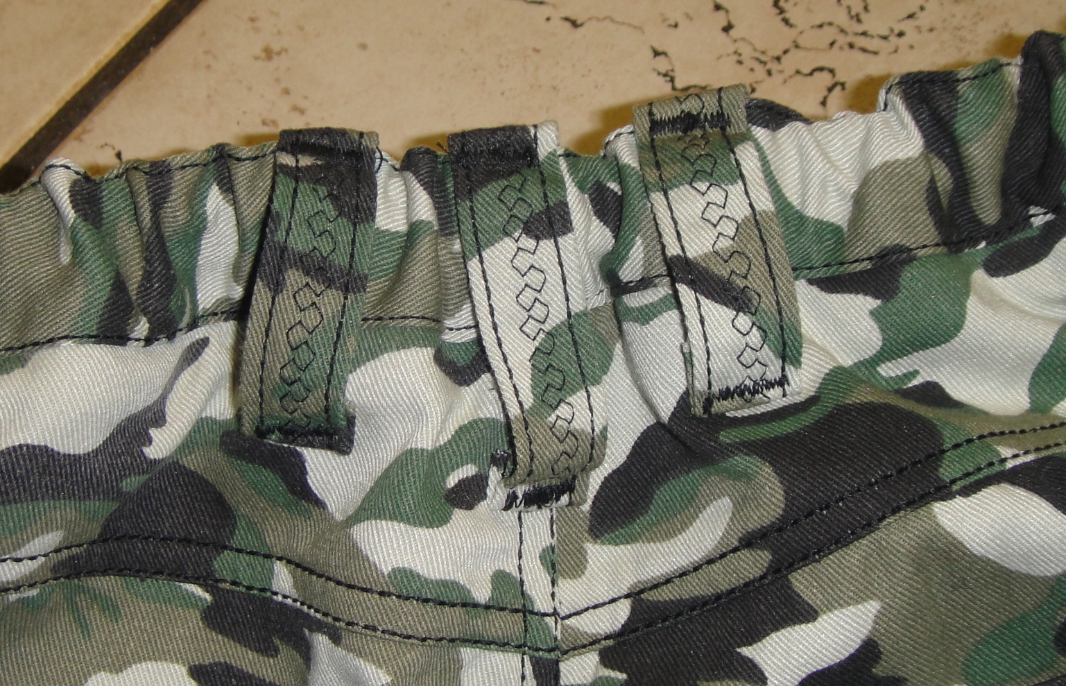 I added buttonholes on the outside before stitching the hems, to run the drawstrings (aka shoelaces) through. Back when I made the first pair of camo capris, I bought a metre or so of narrow black twill-tape for the drawstrings. I couldn’t find it when I finished that project, so wound up using shoe-laces instead. It’s kicked around on and off since then, (notably being used in this project) but again today I couldn’t find it. I did, however, find more shoelaces. (And I can never, ever find shoelaces when my shoes need them…)