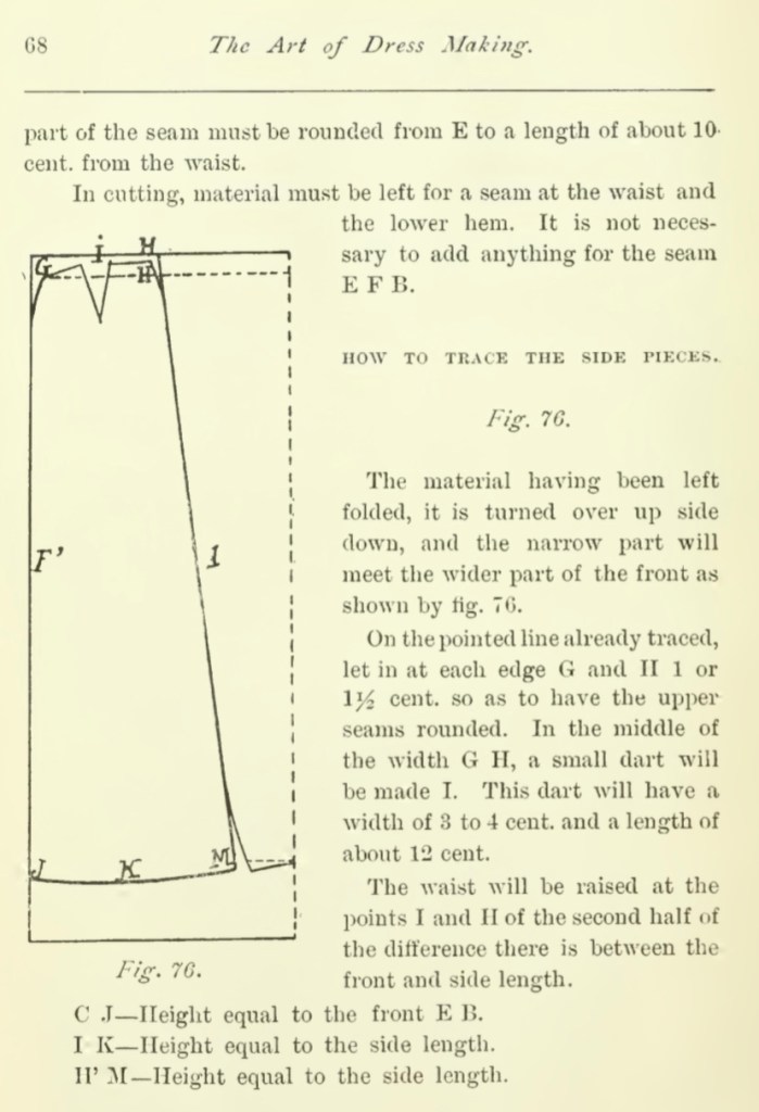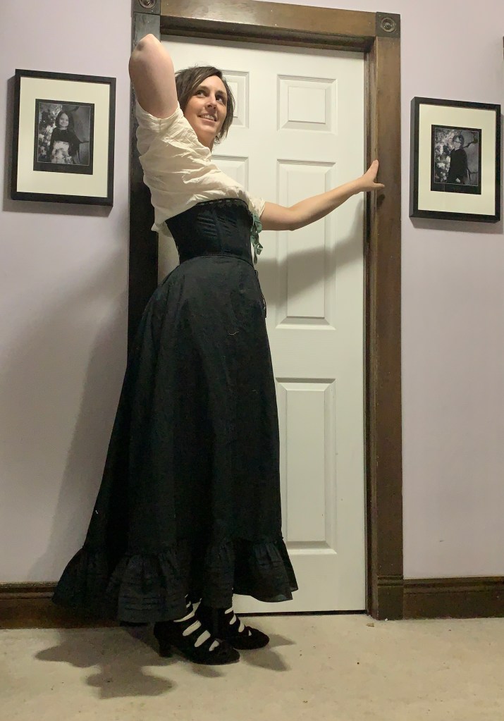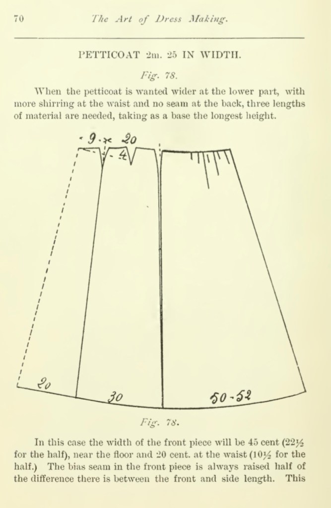 I managed the shorter, I think not so much the “scanter,” since I pretty much followed her instructions (later in the book) for cutting out a regular skirt, and didn’t down-scale my fullness much/at all. Though I only did one set of side-gores for the skirt, not two. This petticoat will pretty much work over a bustle, whereas I get the impression that most flannel petticoats were for wearing under the bustle, to keep the legs warm. Not 100% sure, though.