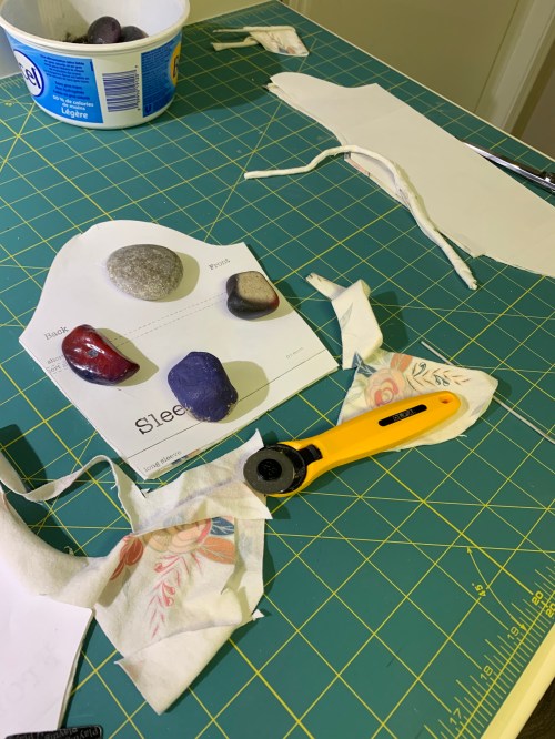 I cut it out entirely using my rotary cutter, which is nice for small pieces and wiggly knits, especially since I took over some of the countertop in the basement kitchenette to have my cutting mat at a comfortable no-bending-required level. It’s especially nice for cutting perfectly even binding pieces, which helped a lot with the bound edges in this thing, and I do think they turned out pretty nicely, if I do say so myself.