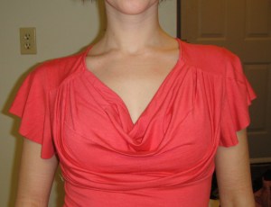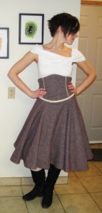 Also for the record, I myself have a 33″ bust and a 5″ difference with my waist on a good day. /sigh. This is not a very stretchy fabric, but if you’re an actual 35″-bust you probably want to make sure you use a fabric with at least a modest amount of give. There’s a fairly significant amount of negative ease at the bust, which is actually the narrowest point on the pattern. Bonus for me, it meant I didn’t need to adjust the waist shaping for my short waist!