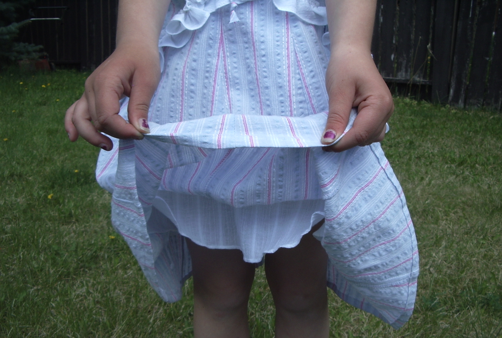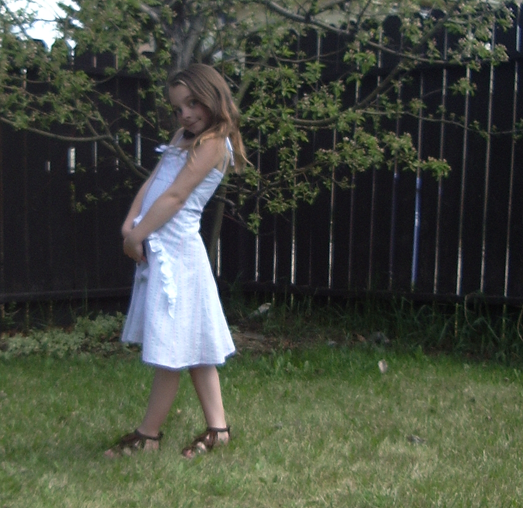 I realized after stitching up the skirt panels, that I’d had my needle set in the left-most position, so each of those many seam allowances (it’s essentially a 10-gore skirt) was just a smidge wider than it should’ve been. Oops. So I did have to shave a smidgeon off the bodice. I cut the size 128, as I was told my husband’s little cousin is a “skinny 8” and that was the size which corresponded with Syo’s bust measurement. Of course, Syo is on the shrimpy side for her age, too, but mostly that’s in height—she’s fairly sturdy and has my broad shoulders. Here’s hoping it fits. If not—I’m sure there’s a niece somewhere it’ll fit. I also added about 4 cm to the length, just at the hem of the skirt.