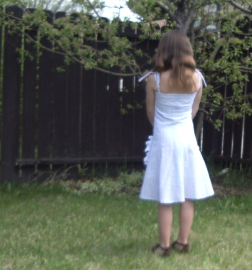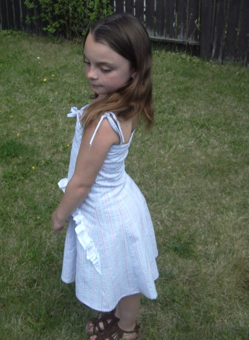 The pattern (OK, the photos from the magazine, again, didn’t look at the instructions) has you leave a gap in the stitching at the CF notch for the drawstrings to emerge. Â This is easy, but there’s no real good way to finish the edges, and I’m kind of convinced that after a few wearings there’s going to be threads poking out like crazy, barring some hand-stitching. I considered putting a tiny little buttonhole in the front on either side of the notch, but when the chips came down I took the easy route. An eyelet would be cool, too, if you made a punk-y version of the dress. Which would be really fun, actually. Wouldn’t it be awesome made out of old metal-band T-shirts, with exposed construction and some scraps of black lace and studs?