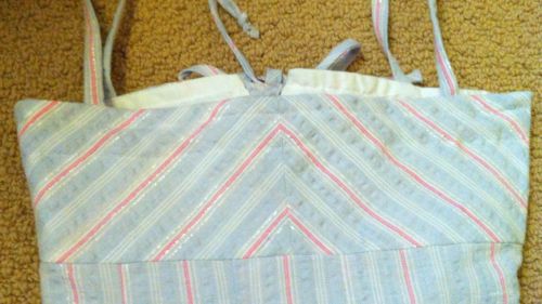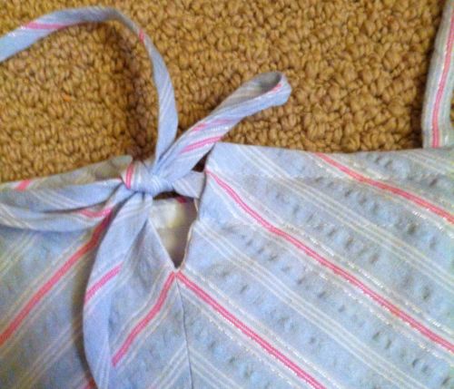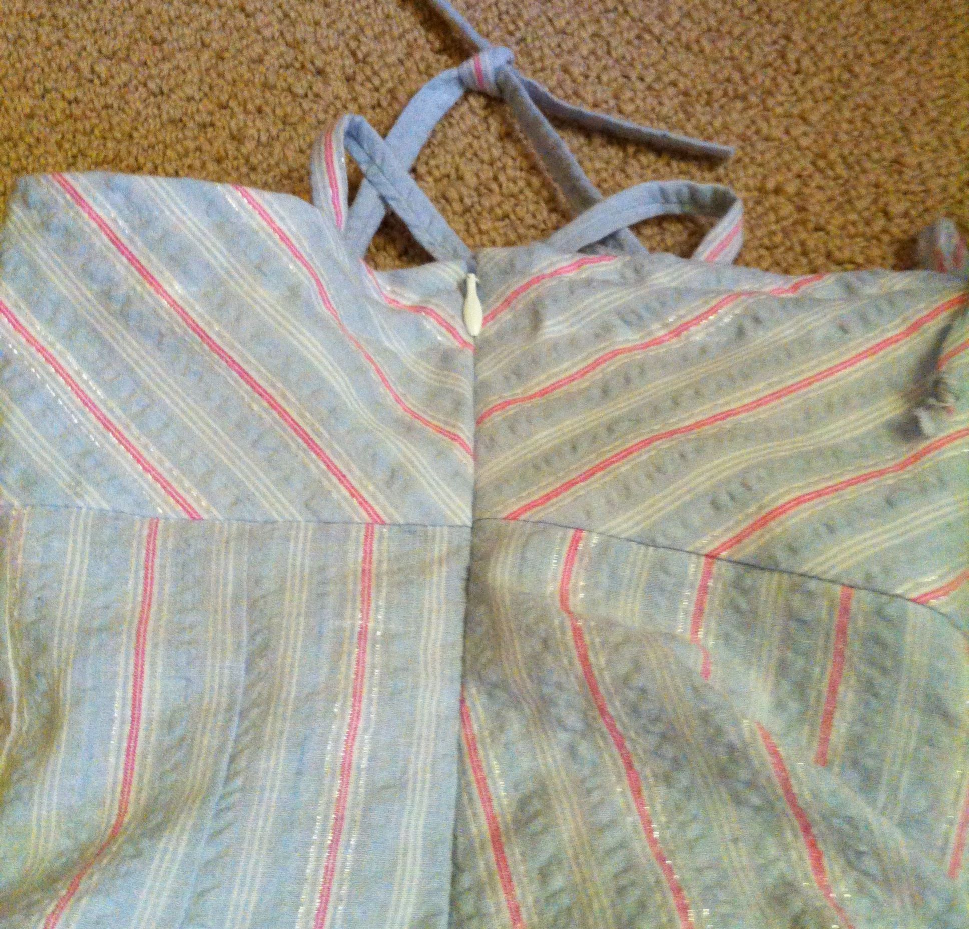 Being the brilliant thing that I am, I decided I was going to try and do chevron stripes on the bodice. Not being completely idiotic, I decided I would underline the bias bodice pieces with some  leftover cotton (lawn? batiste?) cut on grain. This was a good idea since by the time I had the chevroned seams (mostly) matched and stitched the bias pieces, they weren’t exactly the same size and shape they started out as. Seersucker’s kinda shifty at the best of times, and my relationship with precision is, well, hit and miss.